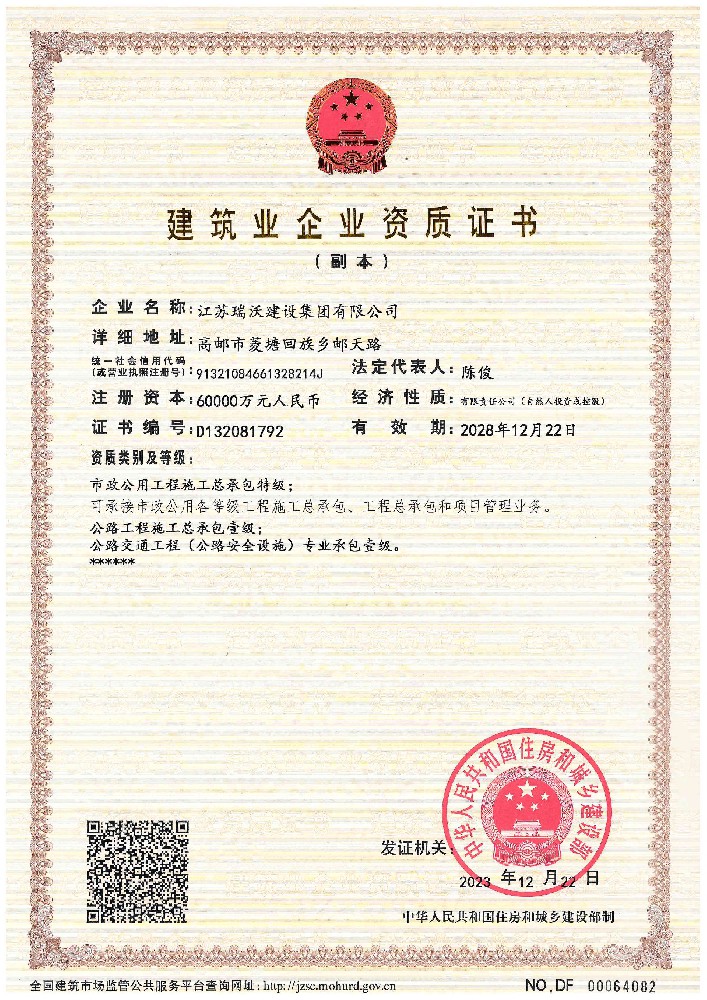 江蘇瑞沃建設(shè)集團(tuán)有限公司成立于2007年,是一家以市政、交通工程建設(shè)為主導(dǎo),集房屋建筑、交通安全設(shè)施、城市道路照明工程、電力工程、隧道工程、航道工程及投融資為一體的綜合性企業(yè)。企業(yè)注冊資本60000萬元,現(xiàn)有各類技術(shù)人員580人,其中中、高級以上人員498人,注冊類人員268人,一、二級建造師166人。公司榮獲“江蘇省建筑業(yè)優(yōu)秀企業(yè)”、“江蘇省五一勞動獎狀”,連續(xù)多年被評為“揚州市先進(jìn)企業(yè)”、“江蘇省建筑業(yè)百強企業(yè)”,連續(xù)八年蟬聯(lián)百強企業(yè)基礎(chǔ)設(shè)施類第一名。